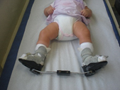 - La méthode Ponseti, qui nécessite une correction initiale par un plâtre changé chaque semaine à l’hôpital. En général, 5 à 7 plâtres sont nécessaires, suivi du port d’une attelle de dérotation d’abord à temps plein pendant les premiers mois puis pendant la nuit et la sieste.