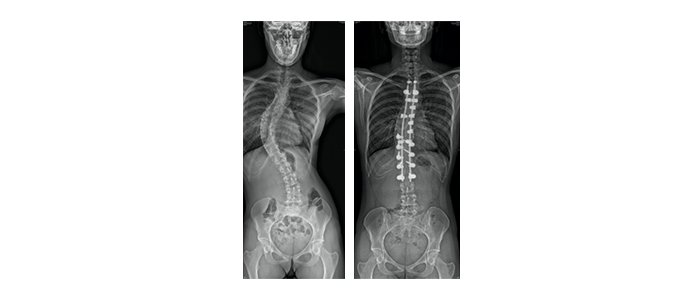 Sur la radiographie de droite, on observe les matériels de fixation qui ont permis de redresser la colonne vertébrale