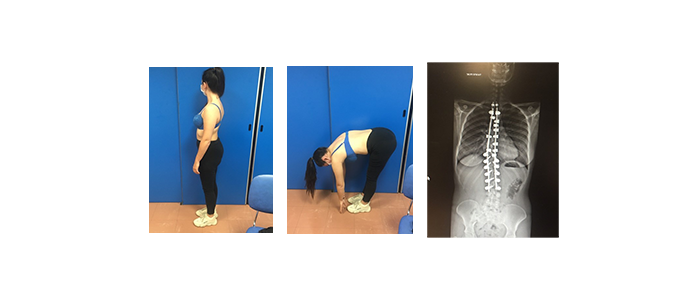 Malgré la fixation de la colonne vertébrale visible sur la radiographie de droite cette jeune fille récupère une mobilité proche de la normale dans les disques vertébraux laissés libres ainsi que le bassin et les hanches